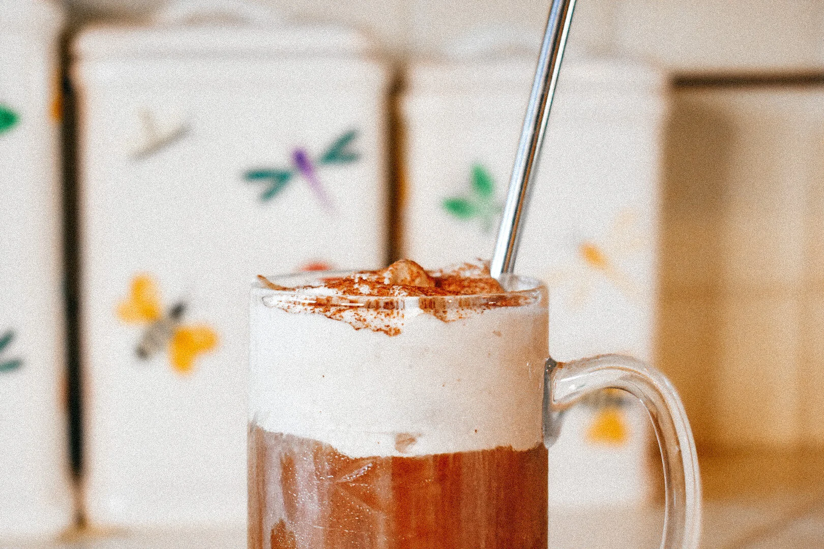 Once incorporated, spoon your cold foam on top of your iced coffee and add a dash of cinnamon or mocha powder on top of your foam to make it look delicious.